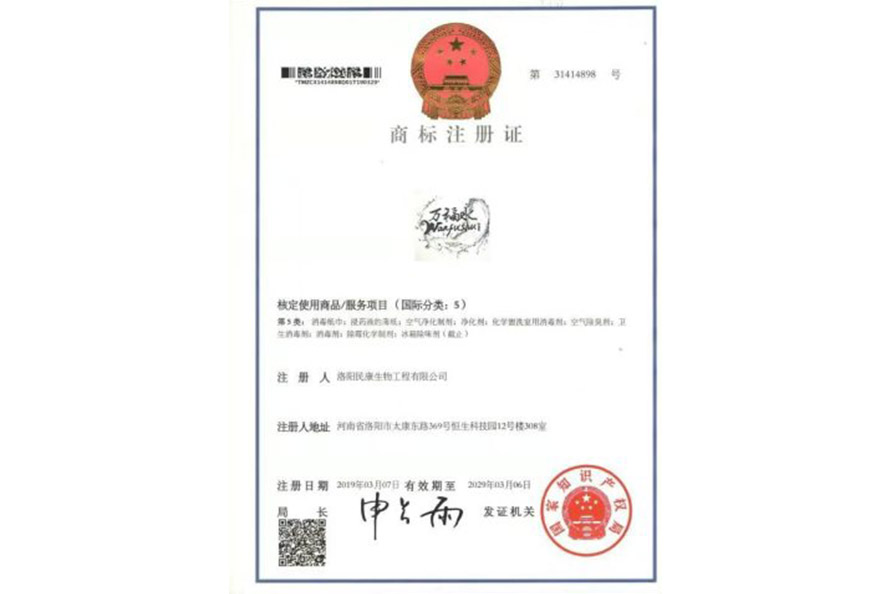 “萬(wàn)福水”商標(biāo)注冊(cè)證書(shū)
