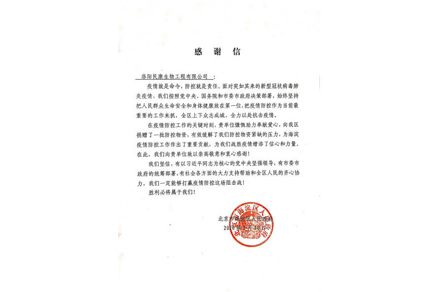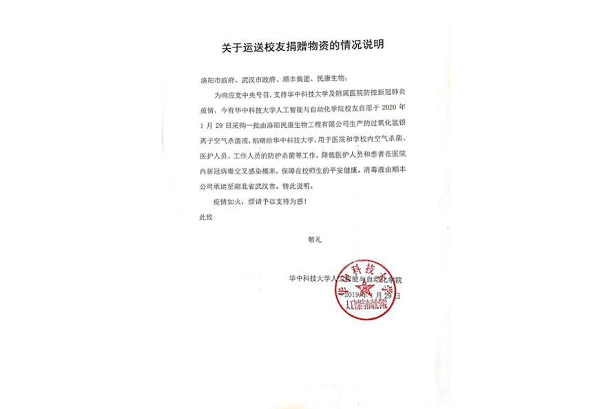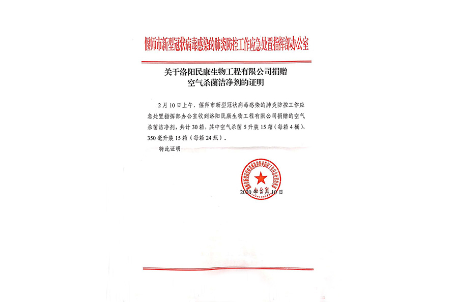 關(guān)于民康捐贈(zèng)空氣殺菌潔凈劑證明